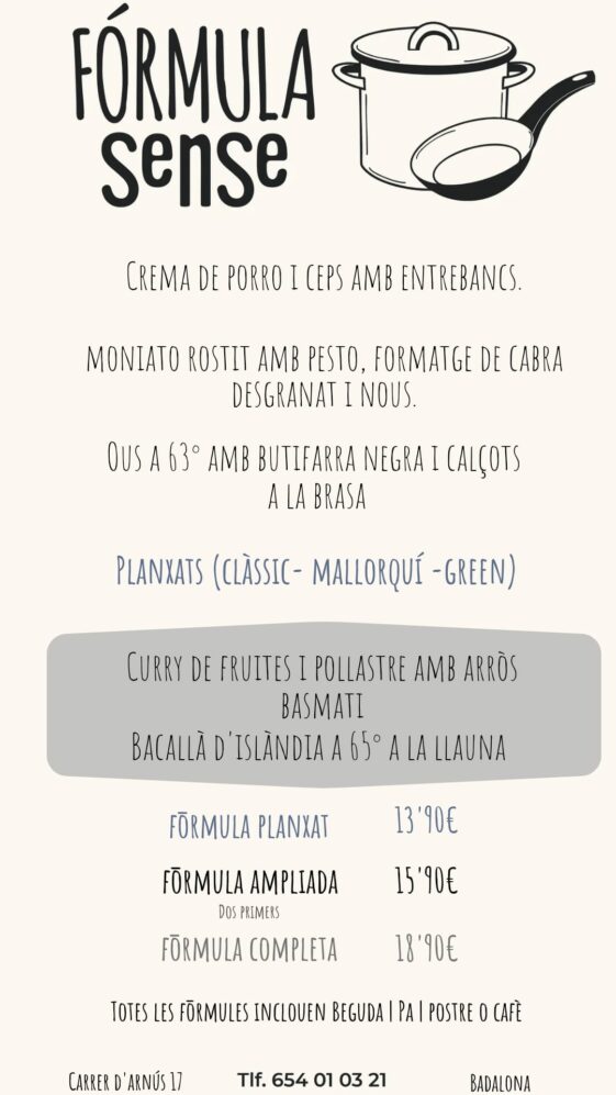 Cada setmana dissenyem un menú de migdia cuidat al detall, la nostra Fórmula SenSe, amb cinc plats elaborats amb dedicació, temps i una autèntica passió per la cuina. Apostem per receptes equilibrades i saboroses, preparades amb ingredients frescos i de qualitat, cuinats lentament per respectar-ne els sabors i textures. El nostre objectiu és oferir-te un àpat complet, casolà i reconfortant, ideal tant per fer una pausa durant la jornada laboral com per gaudir d’un moment tranquil en bona companyia.